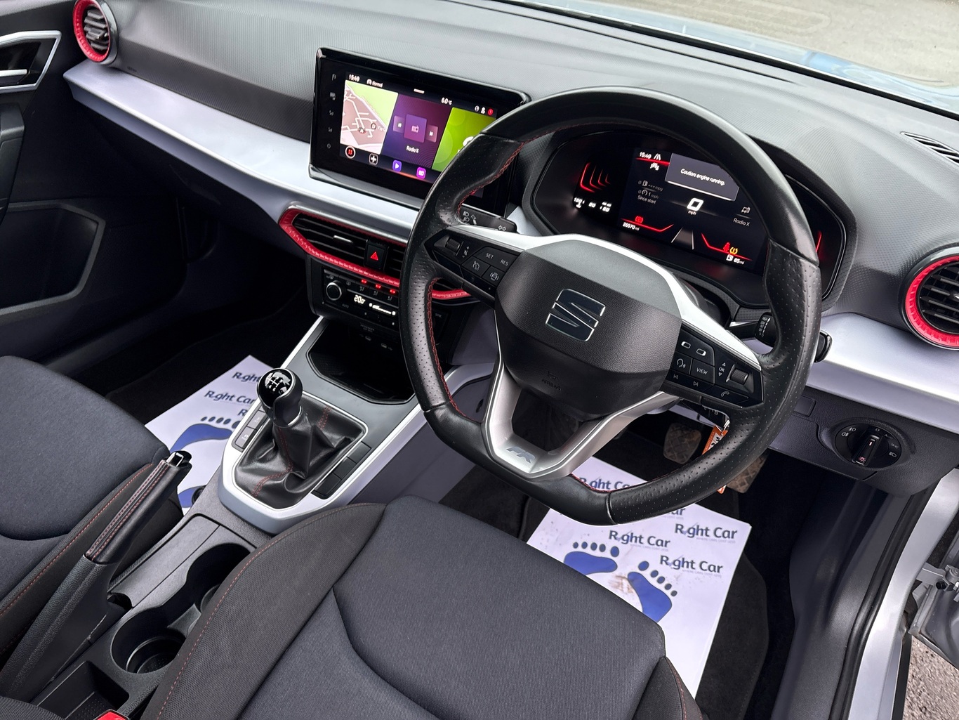 • Perforated flat bottomed leather steering wheel/gear knob/handbrake with red stitching and FR logo