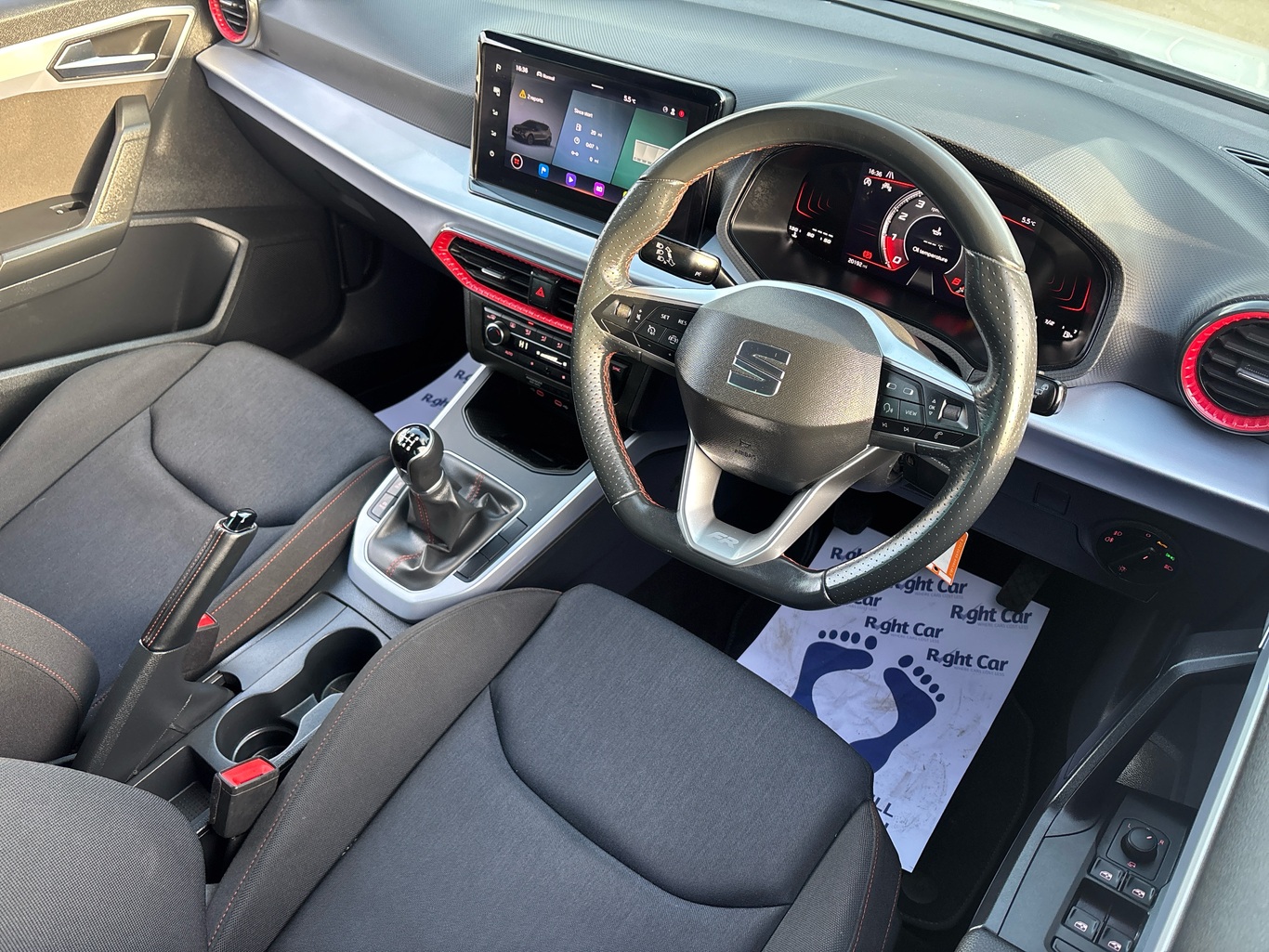 - Perforated flat bottomed leather steering wheel/gear knob/handbrake with red stitching and FR logo